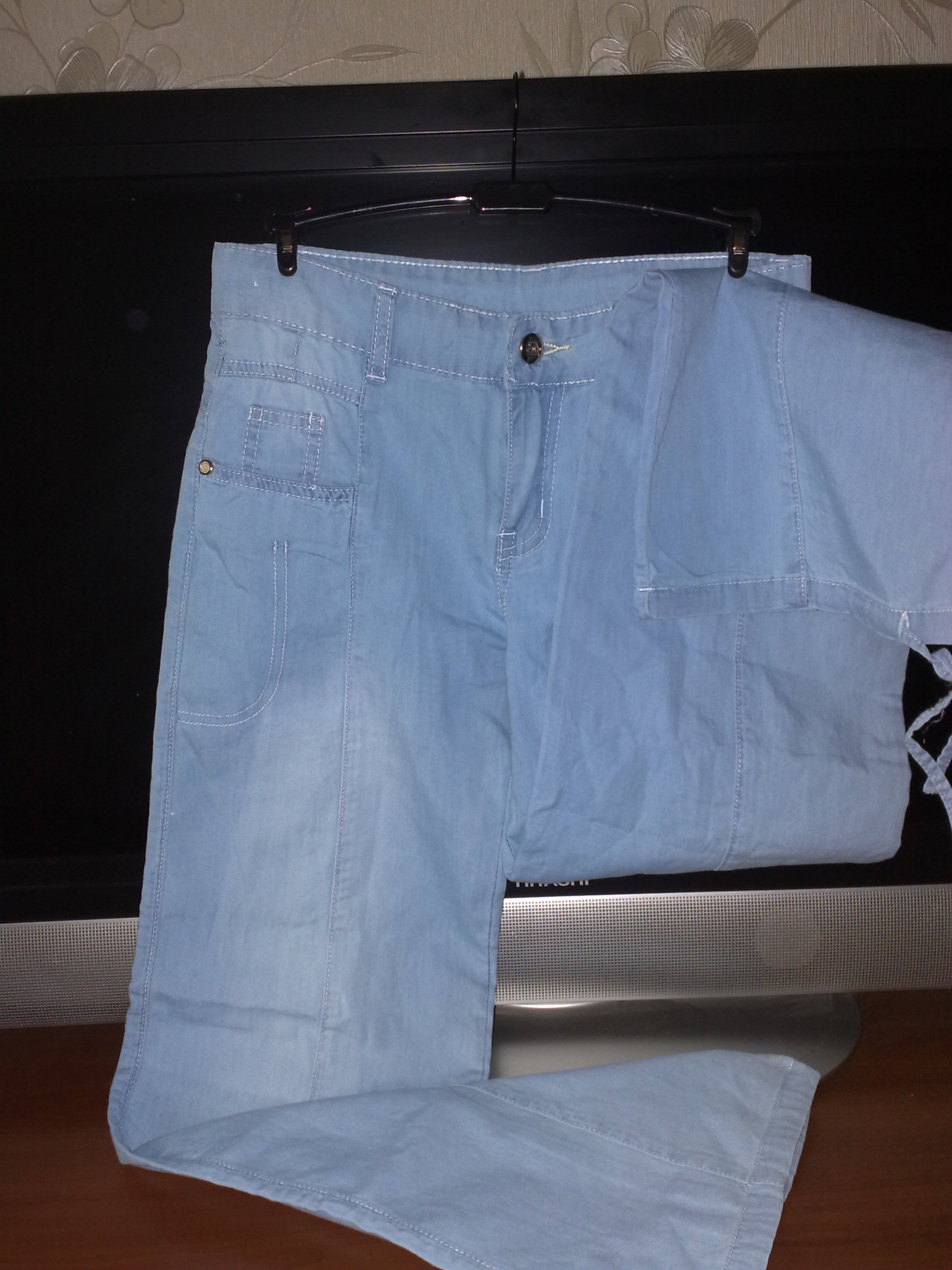 Тонкие хлопковые брюки. На поясе регулировочная резинка, есть завязки внизу.